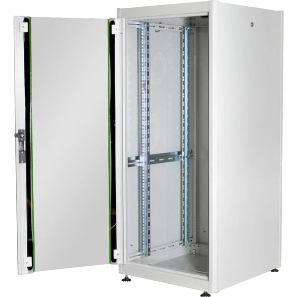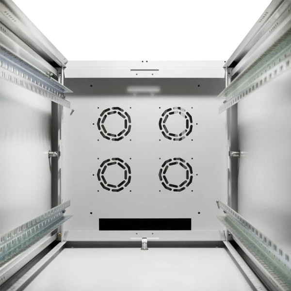 | Kabelführung | Kabelführungskanäle neben den vorderen 19″ Profilschienen; Großer Kabeleinlass mit Moosgummidichtung im Boden; Kabeleinführung mit Bürstenleiste an der oberen und unteren Schrankrückseite | ||