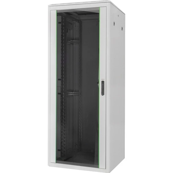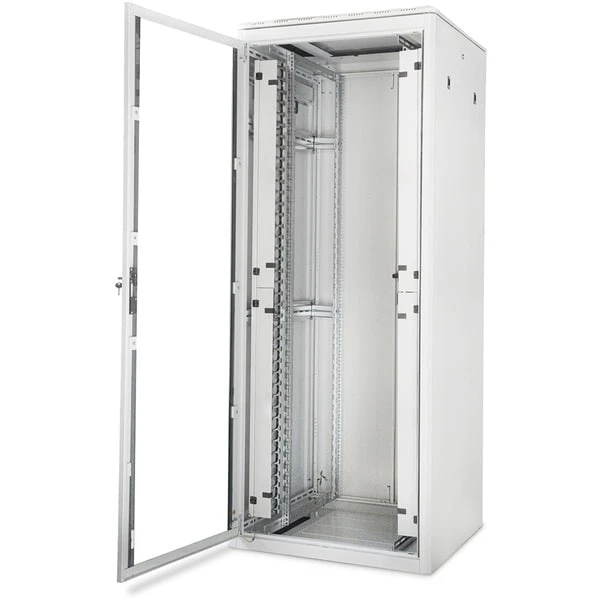 Die Netzwerkschränke der Varioflex-N Serie wurden für eine optimale Verkabelung von Netzwerkkomponenten designt und produziert. Durchdachte Optimierungen bieten marktkonforme Stabilität bei maximaler Flexibilität. Die Fronttür, bestehend aus einem kompletten Metallrahmen mit 4 mm starkem Hartglas sowie die doppelflügelige Stahl-Rücktür sind ausgestattet mit einem Schwenkgriff inklusive Profilhalbzylinder-Schloss (DIN 18 252 (EN 1303)). Beide Seitenwände sind abschließ- sowie abnehmbar. Im Inneren des Schrankes sind vier verkröpfte, galvanisierte 19″-Profile integriert, welche an mehreren Stellen über Tiefenstreben mit dem Grundgerüst des Schrankes verbunden sind. Sie sind tiefenverstellbar und besitzen eine Markierung der jeweiligen Höheneinheit, lesbar in beide Richtungen. Ein modular, durch verschraubte Blindplatten öffenbares Bodenchassis bietet ausreichend Platz für Kabel aller Art. Desweiteren befinden sich jeweils zwei Kabeleinlässe mit Bürste oben und unten im Schrank. Großzügige vertikale Kabelkanäle mit Kabelführungshilfen aus Kunststoff und Blende, verbaut in der Frontseite, runden die vielfältigen Eigenschaften des Netzwerkschranks einwandfrei ab.Art.-Nr.: 100005835