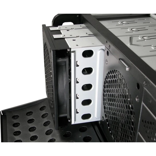 | Anmerkungen | 3x 120-mm-Lüfter im Gehäuseinneren vorhanden, abschließbare Frontklappe mit Staubfiltereinsatz, Laufwerkskäfige herausnehmbar und wahlweise positionierbar, 3,5″-Laufwerke schraubenlos montierbar | ||